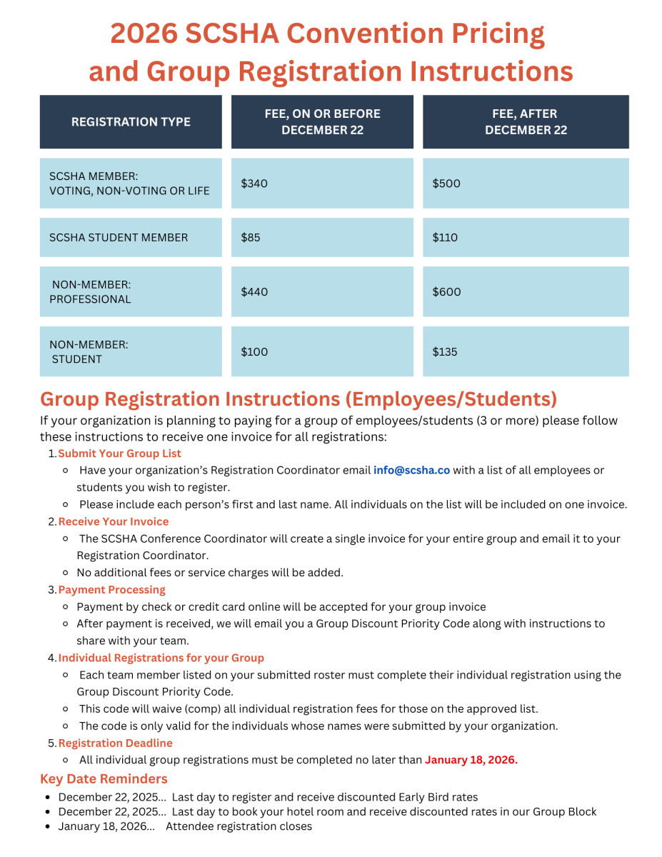 Consider joining our association first, then register for the 2026 Convention at discounted member rates and enjoy the benefits of being a SCSHA member throughout 2026.